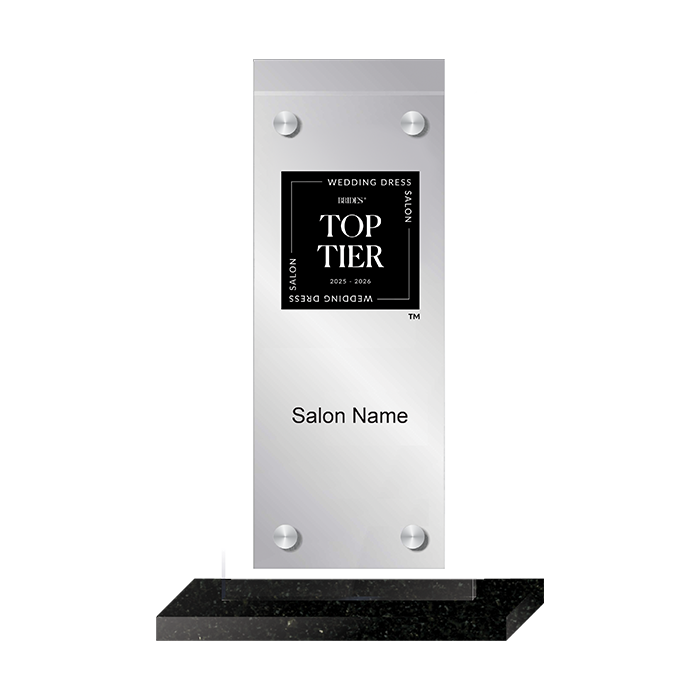 Glass tower with brushed aluminum metal accent plate on black granite base. Accent plate includes the Brides Top Tier logo and can be customized with your salon name.