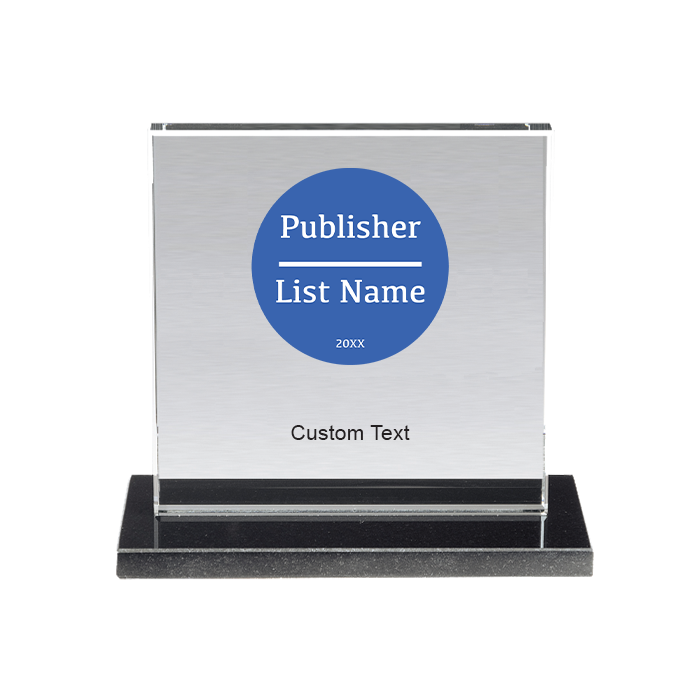 This glass award on a granite base is customized with the Publisher List logo and company name.